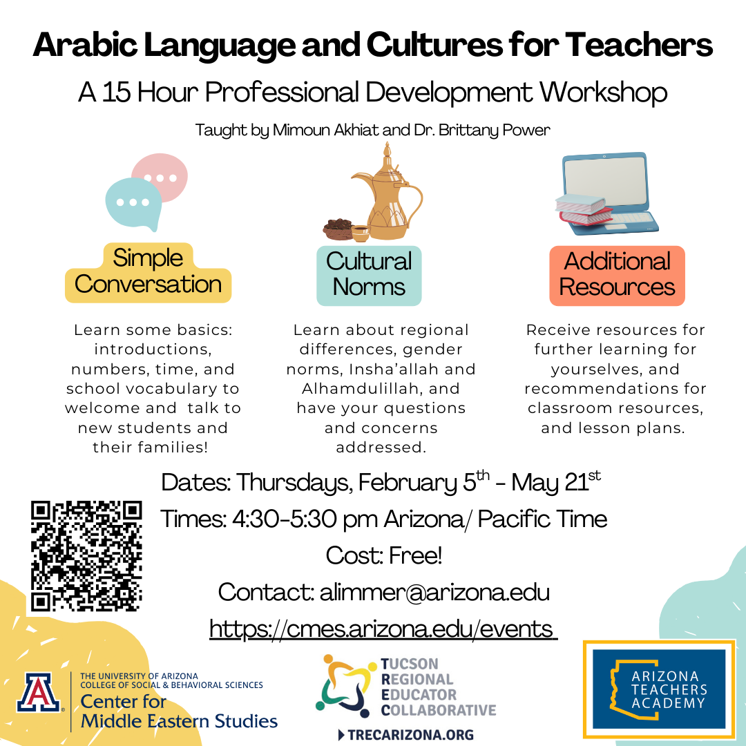At the end of the session, everyone who attends regularly will receive a certificate for 15 hours of professional development from the University of Arizona Center for Middle Eastern Studies. The session will meet every Thursday, from 4:30-5:30 PM Arizona Time, beginning on February 5, 2026 for 15 weeks.