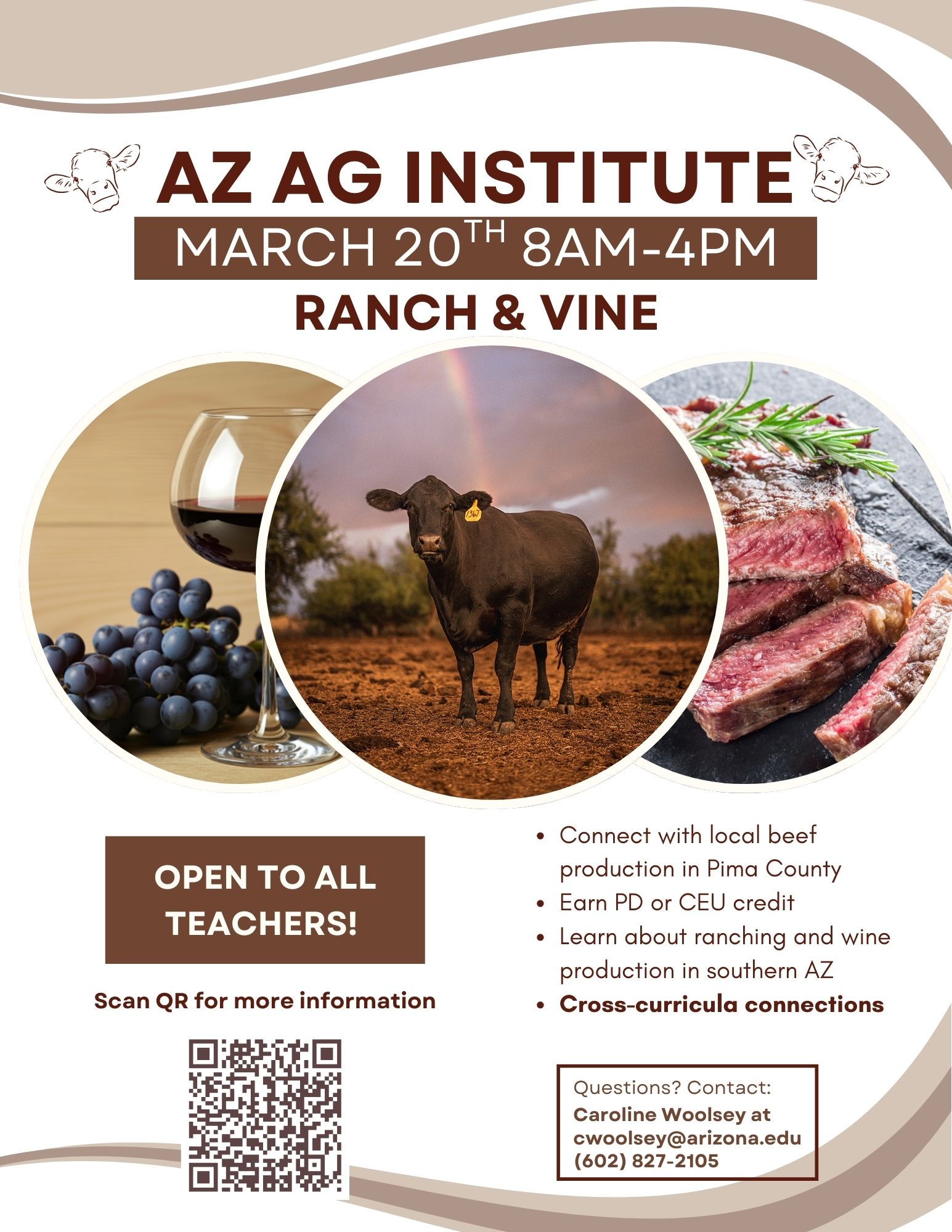 Join us for the Arizona Agriculture Institute Pima County Ranch & Vine Spring Tours, a hands-on professional learning experience that brings Southern Arizona agriculture to life. During this immersive tour, educators will explore both beef production and the wine industry, gaining a firsthand look at how food and agricultural products are raised, grown, and produced in our region.