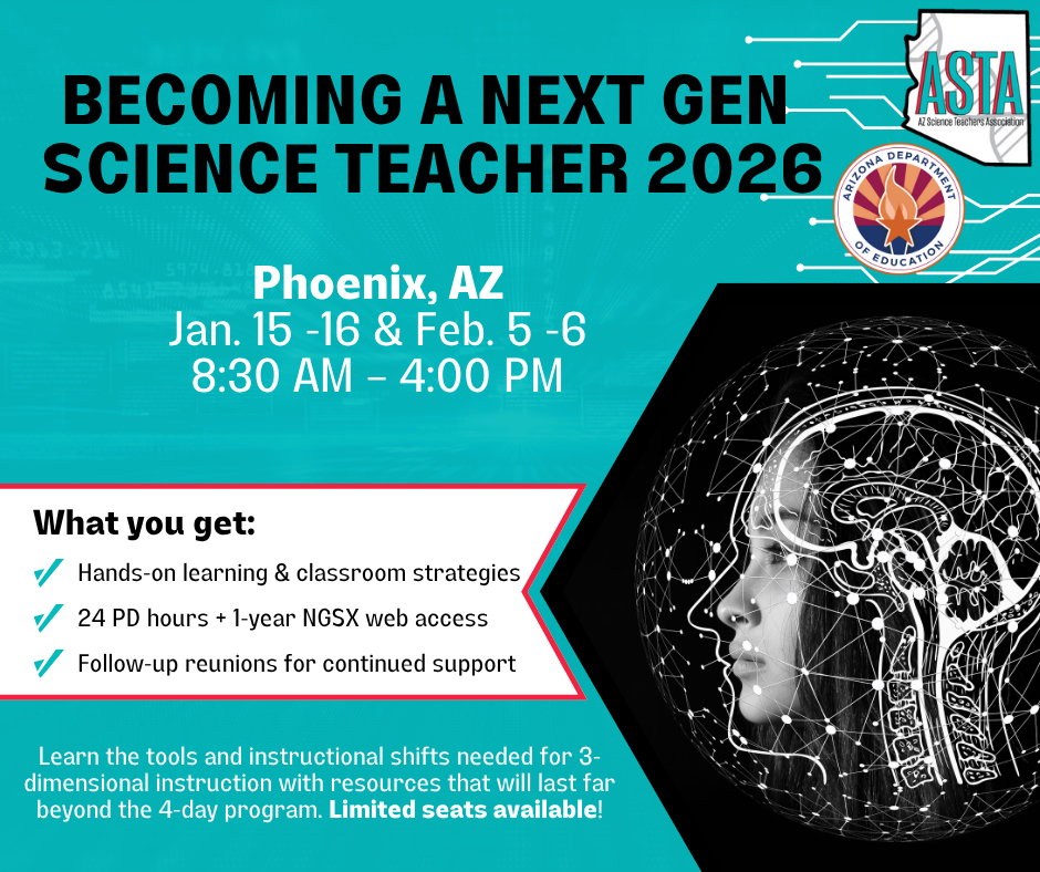 ASTA is excited to bring “Next Generation Science Exemplar Program (NGSX) to Arizona. NGSX promotes the use of high leverage tools, tasks, and resources carefully and specifically designed to deepen an understanding of classroom strategies needed to support student three-dimensional science learning. It is NOT a curriculum. It IS the tools and instructional shifts needed for 3-dimensional instruction no matter what curriculum resources are being used in the classroom.