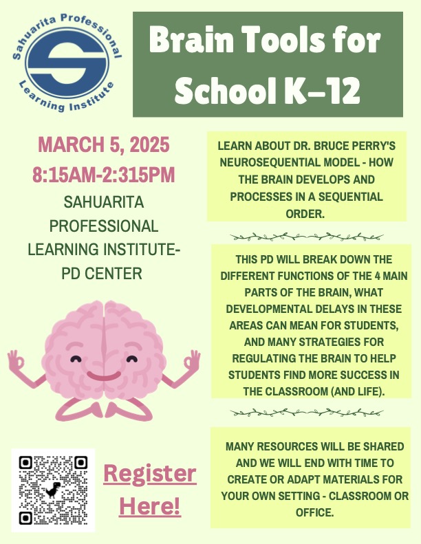 Learn about Dr. Bruce Perry’s Neurosequential Model – how the brain develops and processes in a sequential order. This PD will break down the different functions of the 4 main parts of the brain, what developmental delays in these areas can mean for students, and many strategies for regulating the brain to help students find more success in the classroom (and life). Many resources will be shared and we will end with time to create or adapt materials for your own setting – classroom or office.
