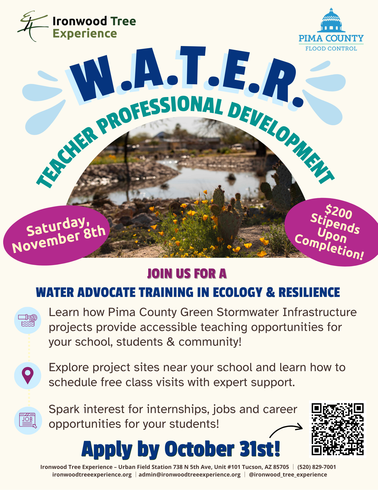 When/What/Where: Saturday November 8, 2025 from 8am-3:30pm– Community WATER Advocate program is a partnership between Pima County Regional Flood Control District and Ironwood Tree Experience. This educator workshop is designed to open up the urban landscape as a dynamic area for learning. Pima County’s Stormwater Parks are located across the City. Through engineering that mimics natural systems these parks reduce flooding potential by holding water and supporting an urban oasis of native plants and animals. Educators will get an up close and personal connection with 2 of these parks as potential sites for school programs ranging from the Sciences to Arts and History.