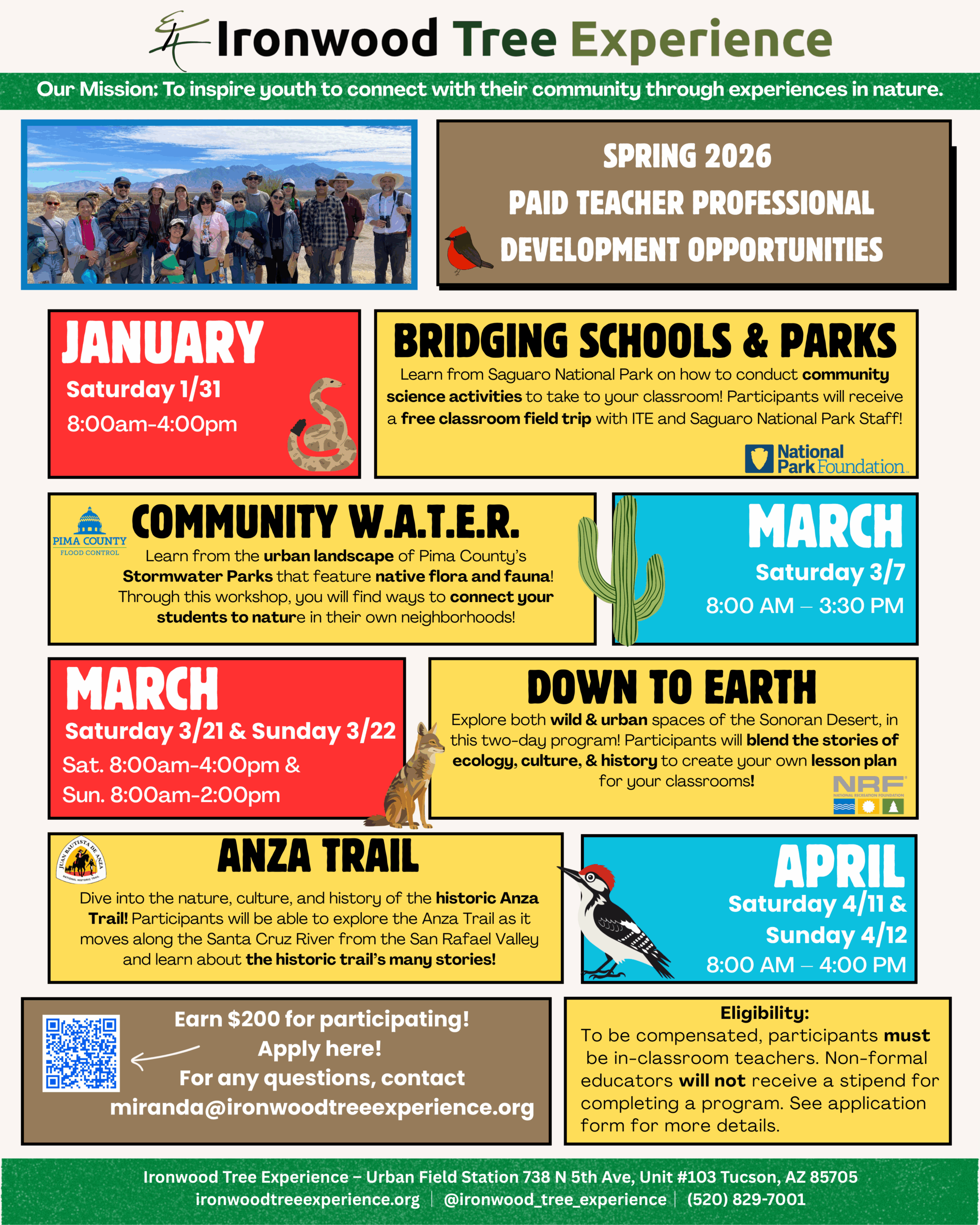 When/What/Where: Saturday April 11 & Sunday April 12, 2026 from 8am-4pm– Connecting Southern AZ Communities with the Anza Trail Teacher Professional Development is an exciting collaborative partnership between the National Park Service, Juan Bautista de Anza Trail and Ironwood Tree Experience.