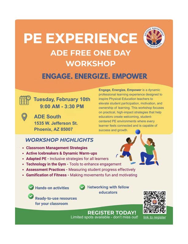 Get ready to move, learn, and be inspired! Join us for a FREE, hands-on professional development event designed for PreK–12 educators who are passionate about elevating physical education. This dynamic one-day workshop will equip you with innovative strategies, inclusive practices, and practical tools to create meaningful, developmentally appropriate PE experiences for every student.