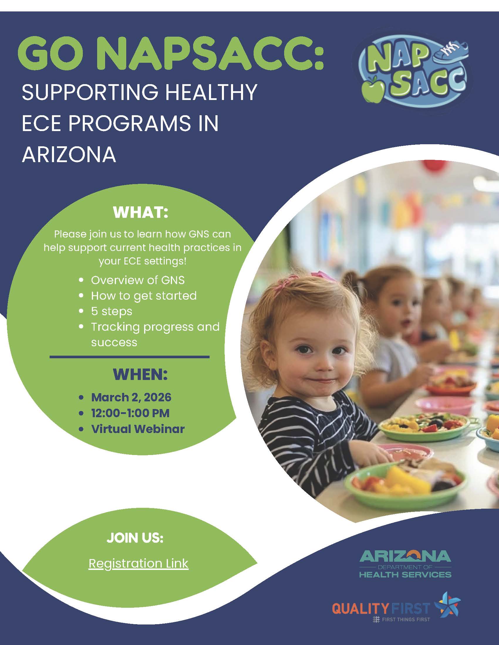 The Arizona Department of Health Services and First Things First are partnering to provide a webinar that can help educate ECE providers on Go NAPSACC, how to get started, navigate online tools and resources, coaching through the five steps of GNS, and tracking progress and success.