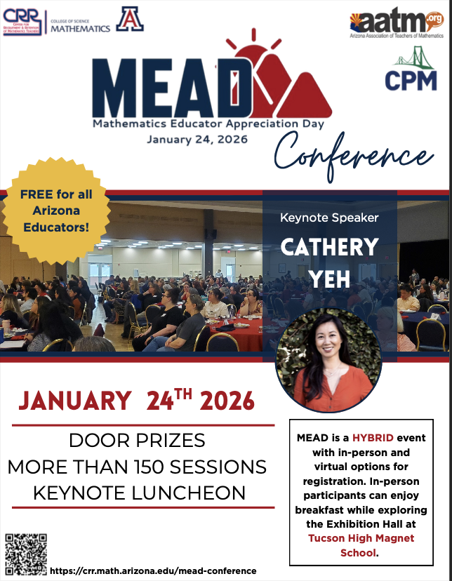 MEAD is Arizona’s largest mathematics education event, and in order to increase accessibility will be HYBRID with options to participate either in-person or virtually in over 150 conference sessions. The conference and keynote address are open to PK-16 teachers and administrators, and offered at NO COST to Arizona educators (thanks to the generosity of a CRR donor).