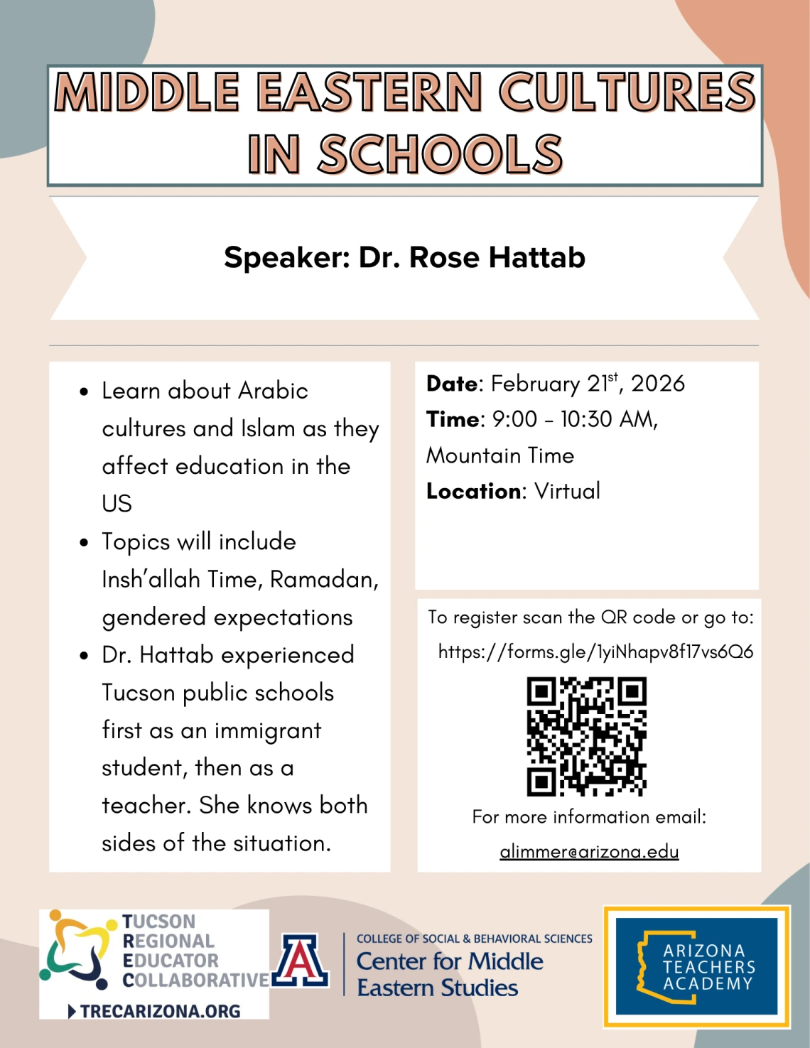 Dr. Hattab was born in Iraq and came to the US as a child. She attended public schools in Tucson, Arizona, and saw her parents learning to work with the local school district through her and her siblings’ education. Dr. Hattab has also experienced the other side of the system as a teacher at Cholla High School, so she is well-situated to help other teachers support the students and families.