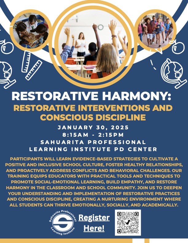 Participants will learn evidence-based strategies to cultivate a positive and inclusive school culture, foster healthy relationships, and proactively address conflicts and behavioral challenges. Our training equips educators with practical tools and techniques to promote social-emotional learning, build empathy, and restore harmony in the classroom and school community. Join us to deepen your understanding and implementation of restorative practices and conscious discipline, creating a nurturing environment where all students can thrive emotionally, socially, and academically.