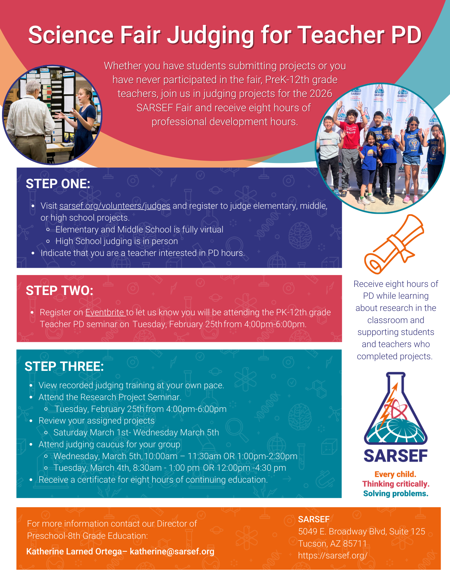 Support young scientists and engineers across the state and get recertification hours at the same time! Join SARSEF in judging projects for the 2026 Southern Arizona Regional Science and Engineering Fair and receive a certificate for eight hours of professional development. Whether you have students submitting projects or you have never participated in the fair, all Pre-K through 12th grade educators are welcome to learn more about implementing research projects in their classrooms and support the work of students and classes from all over southern Arizona.