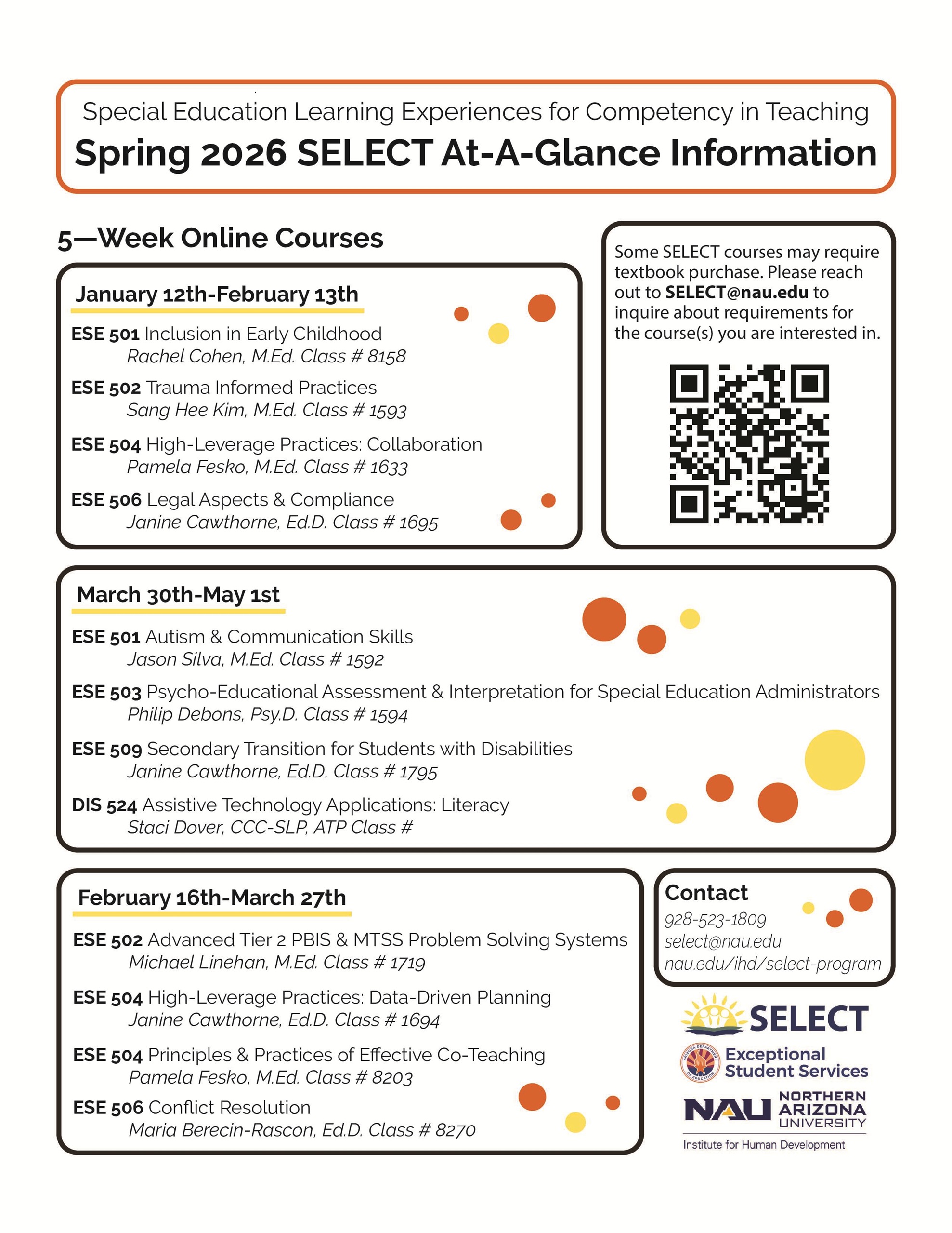 Special Education Learning Experiences for Competency in Teaching (SELECT) is sponsored by the Arizona Department of Education and offered through the Institute for Human Development at Northern Arizona University. SELECT courses are recommended for teachers, administrators, related-service personnel, paraeducators, and other interested individuals.