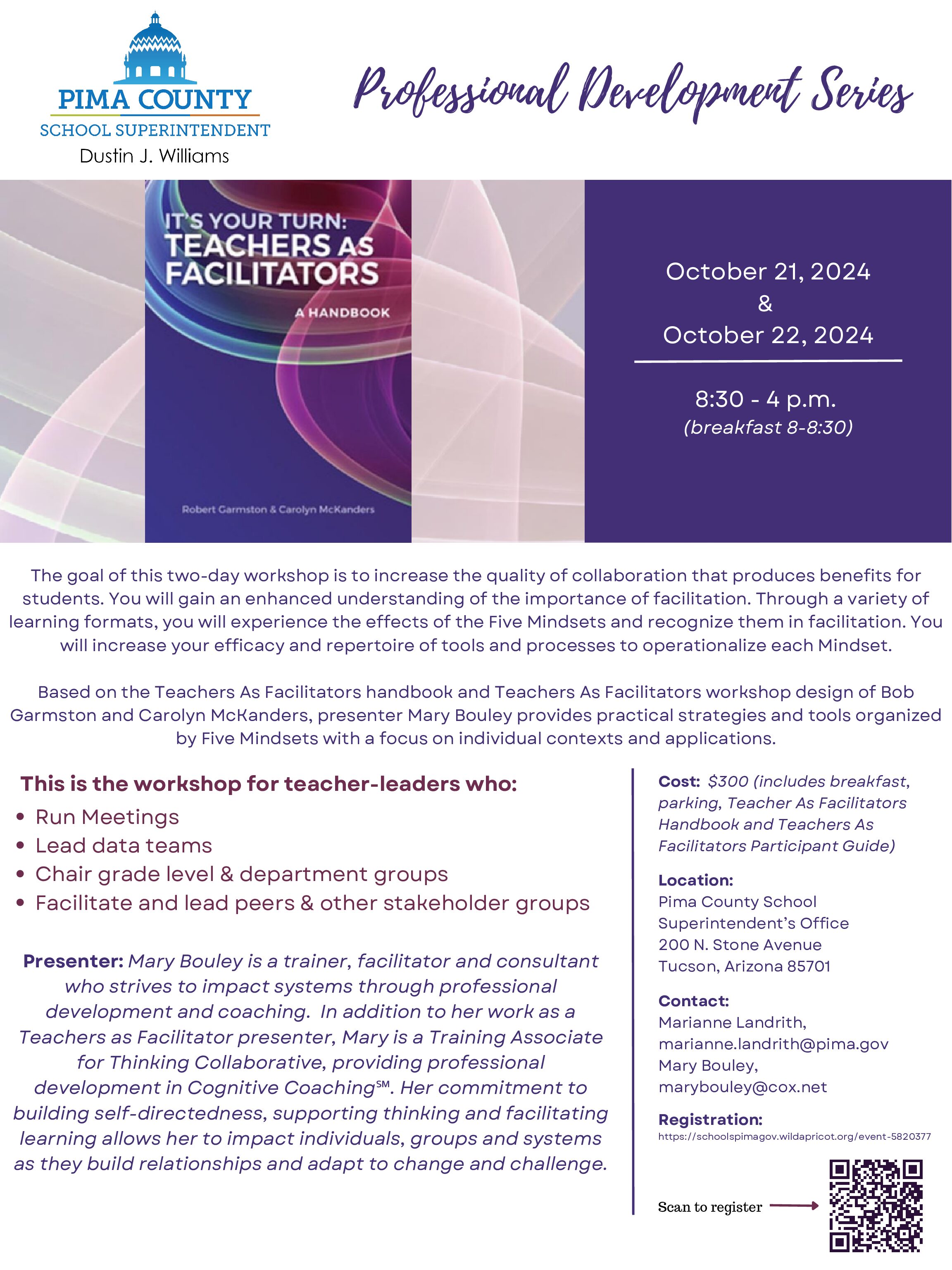 Based on the Teachers As Facilitators handbook and Teachers As Facilitators workshop design of Bob Garmston and Carolyn McKanders, presenter Mary Bouley provides practical strategies and tools organized by Five Mindsets with a focus on individual contexts and applications.