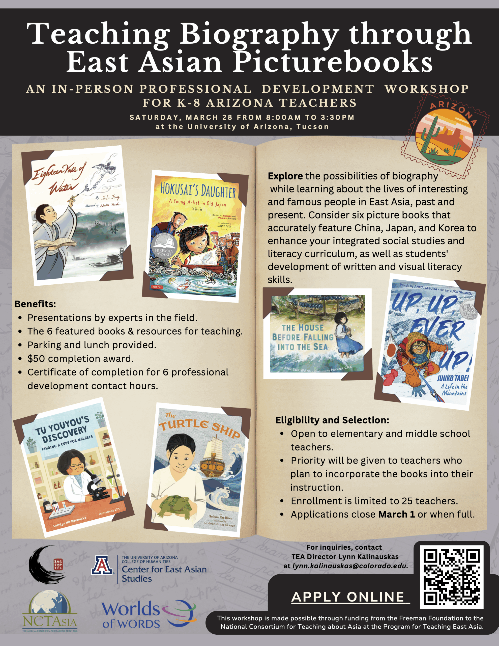 Join us for an engaging, in-person professional development workshop that explores how biography can be taught through high-quality East Asian picturebooks. Educators will examine six carefully selected titles that highlight the lives of fascinating historical and contemporary figures from China, Japan, and Korea.