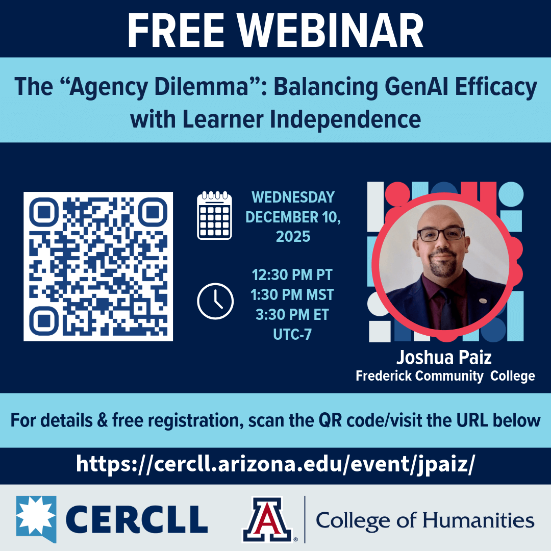 Join Dr. Paiz as he addresses this pedagogical challenge head-on. Moving beyond binary questions of AI adoption, this webinar presents research-based, “human-in-the-loop” frameworks designed to reposition generative AI as a cognitive stimulator rather than a substitute for learner development. Participants will explore concrete strategies to ensure AI tools augment—rather than undermine—students’ critical thinking and authentic voice.